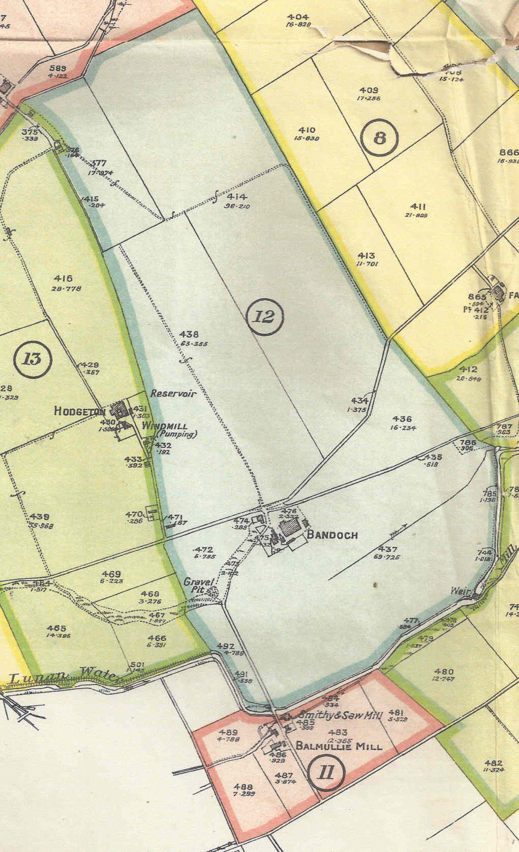 12 | Bandoch [ Map ] | Farmhouse, steading, 4 cottages | 277.767 | 268.574 | 5.490 | 377, 414 (part), 415, 436-8, 472-7, 491-2, 785-6 | Mrs Thomson & J. Mitchell | 350 | M 1928 |