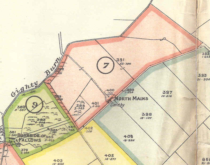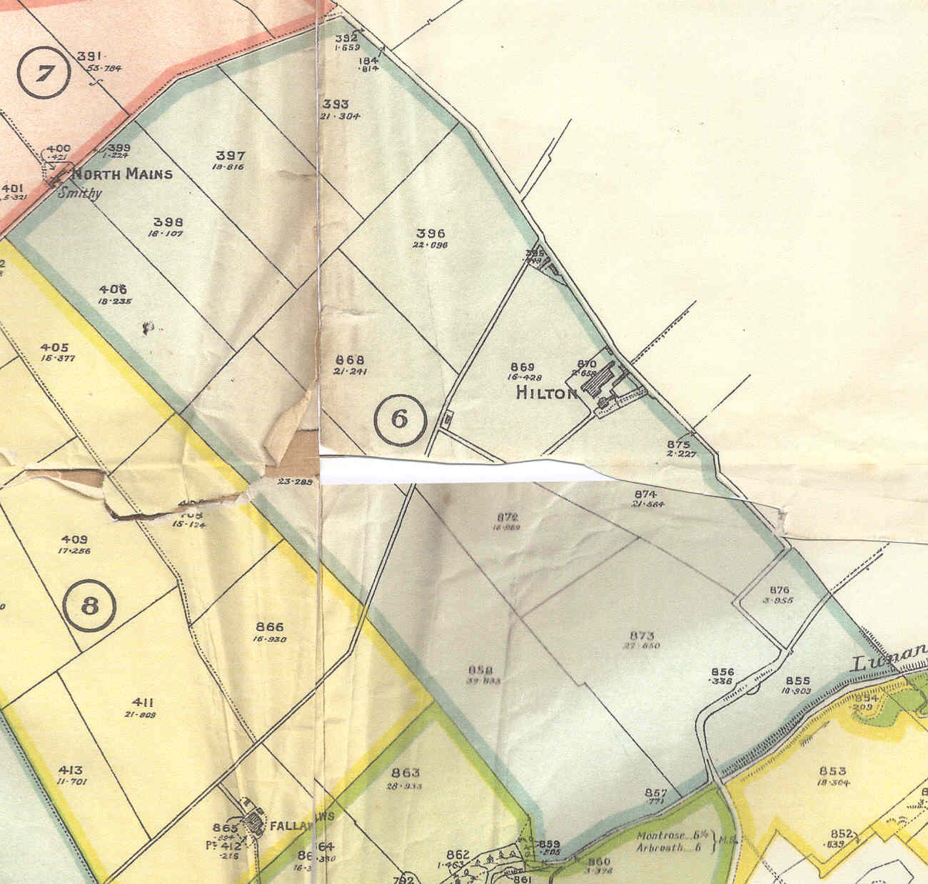 7 | North Mains of Hilton [known as "Knappie Roondie"] [Map ] | Cottage, steading | 65.451 | 53.784 | 4.493 + 5.321 mixed arable & pasture | 388-91, 399-402 | J. Lamb | 25 | M 1918 |