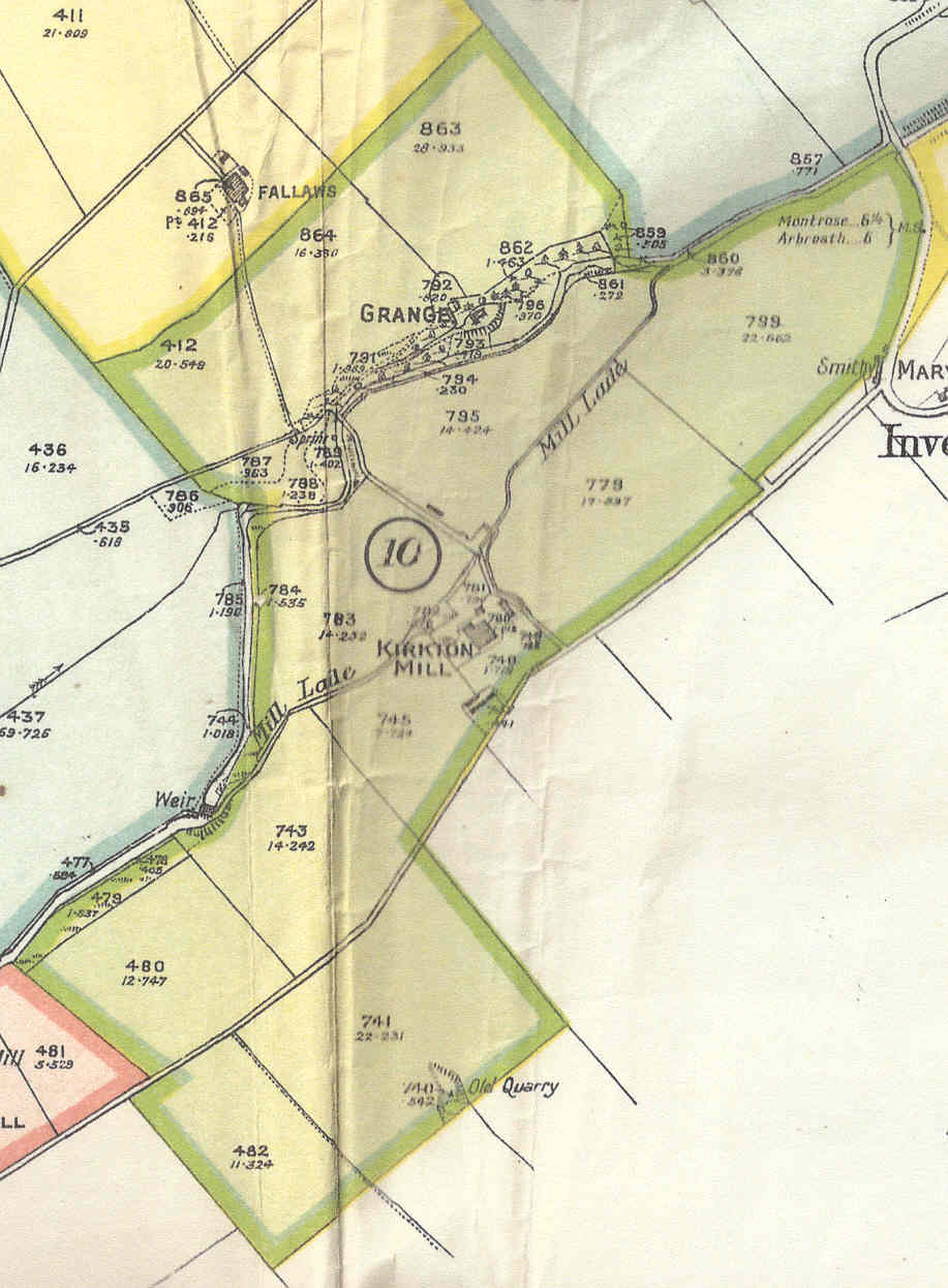 10 | Grange [ Map ] | Farmhouse, steading at Kirkton Mill, 3 cottages | 180.531 | 165.896 | 5.859 +3.937 plantation | 412 (part), 478-9, 482, 740-1, 743, 745, 747-8, 779-84, 787-9, 791-6, 799, 859, 861-2, 863 (part), 864 (part) | John Meikle | 230 | M 1921 |