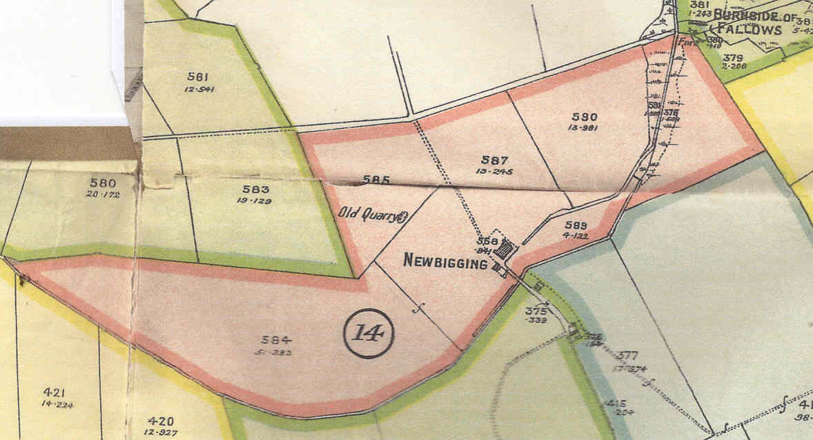 14 | Newbigging [ Map ] | Steading | 108.510 | 103.992 | 3.677 | 378, 414 (part), 584-5, 587-91 | James Hynd | 110 | M 1921 |