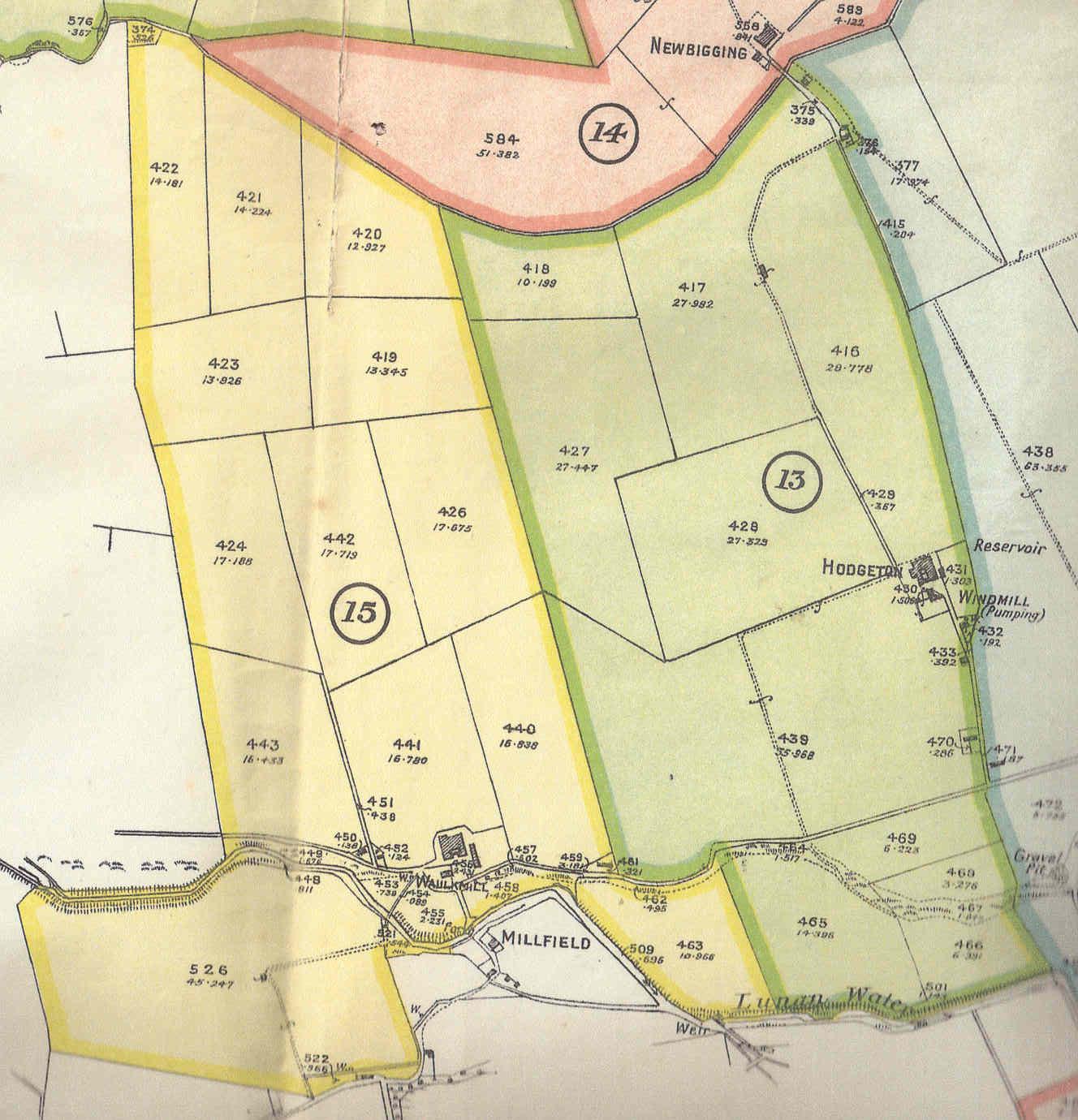 "Field" numbers (some are roads) are those marked on the 25-inch 1903 Ordnance Survey; see these maps of 1903: